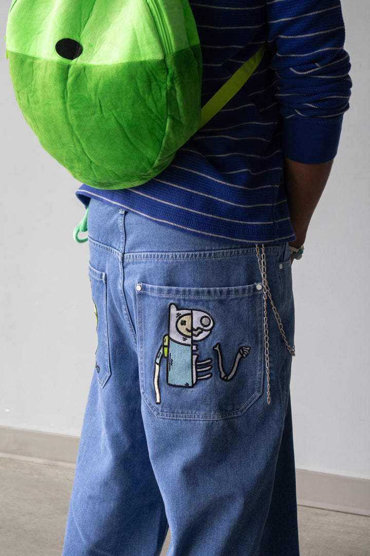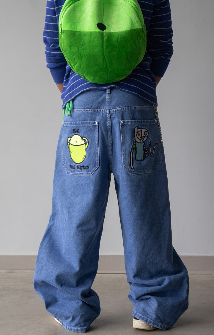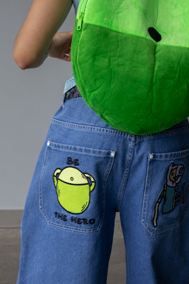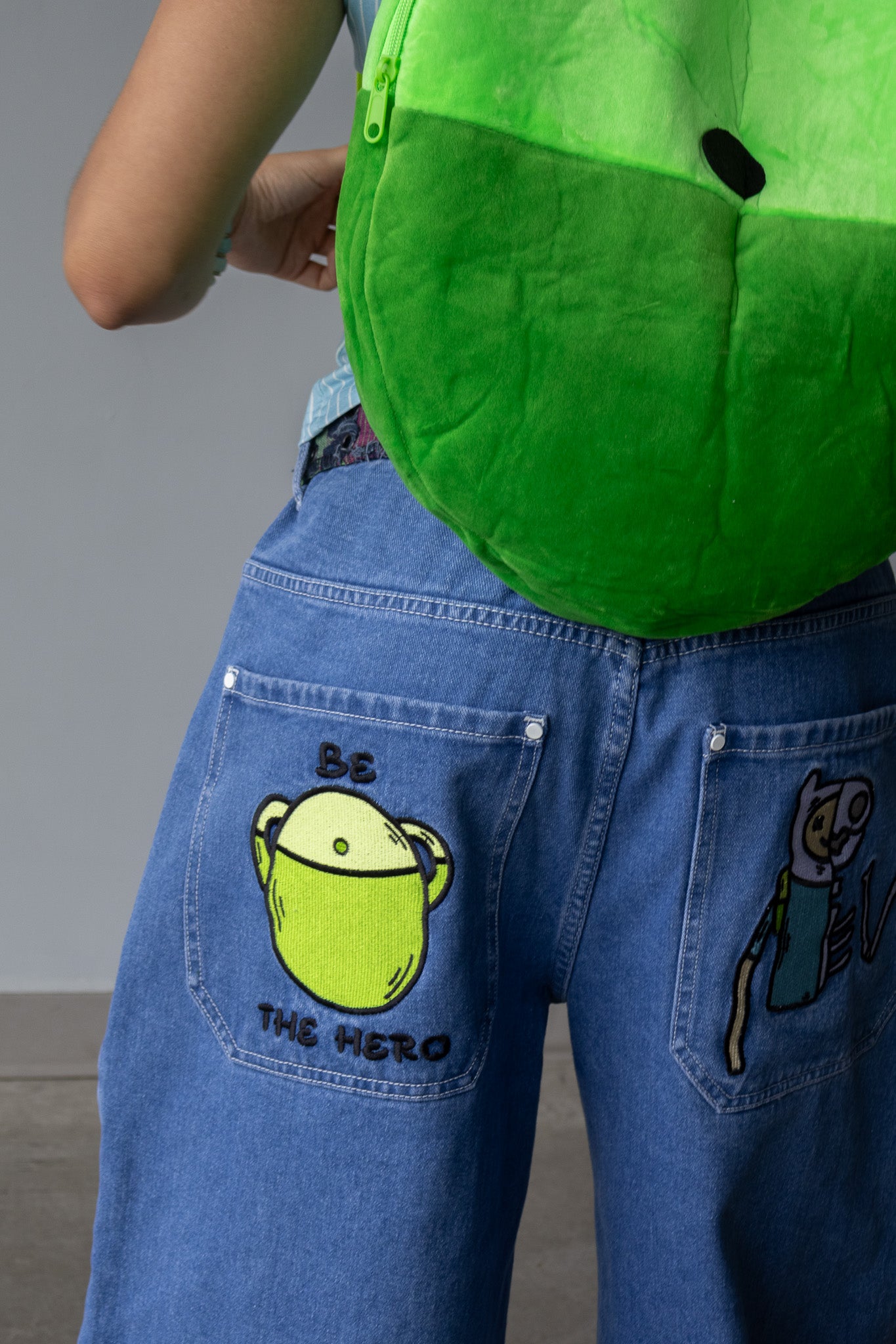 Color: Blue Denim Material: Premium 100% Cotton 14 oz denim Details: Custom white stitching, large back pockets Print: Finn on back right pocket. Backpack with "Be the Hero" on the other. Sword on front pocket.