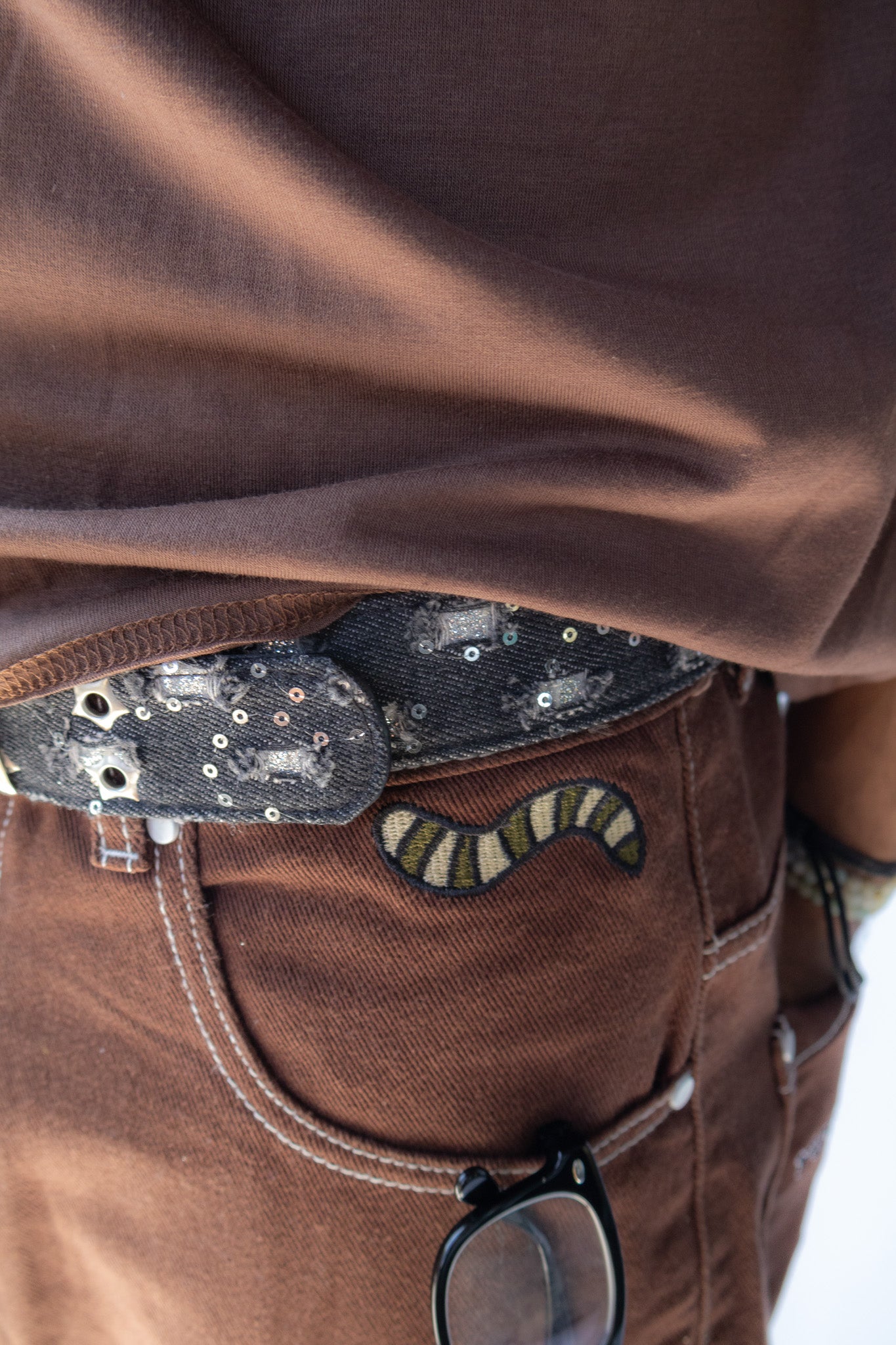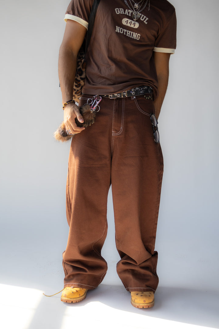 Color: Brown Denim Material: Premium 100% Cotton 14 oz denim Details: Custom white stitching, large back pockets Print: Rigby on back right pocket. BeatBox with "You cant touch music but music can touch you" on the left pocket. Rigby Tail on front pocket