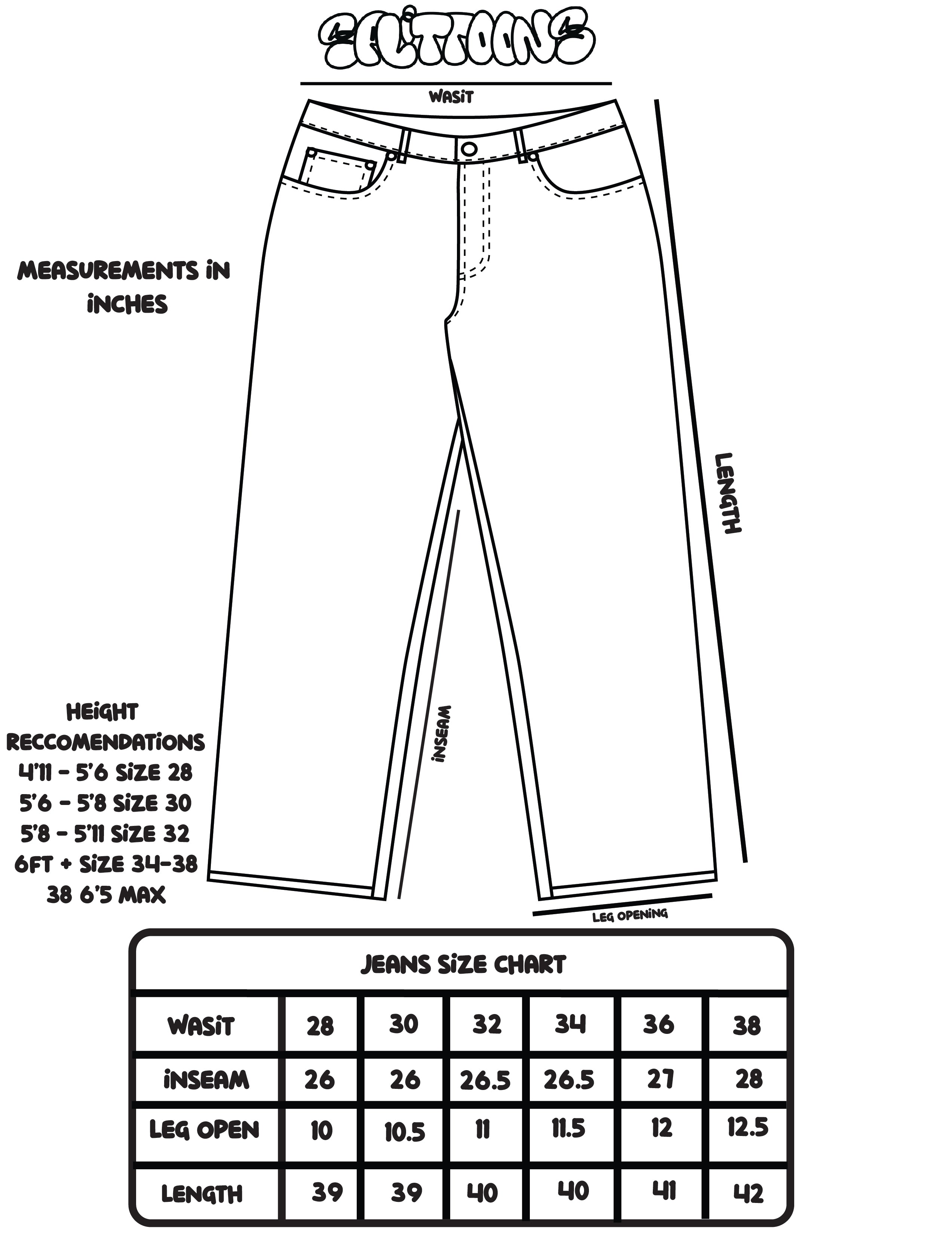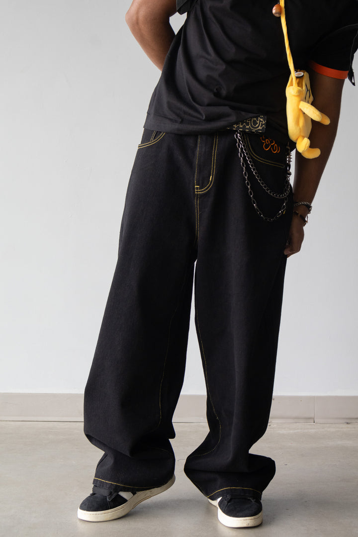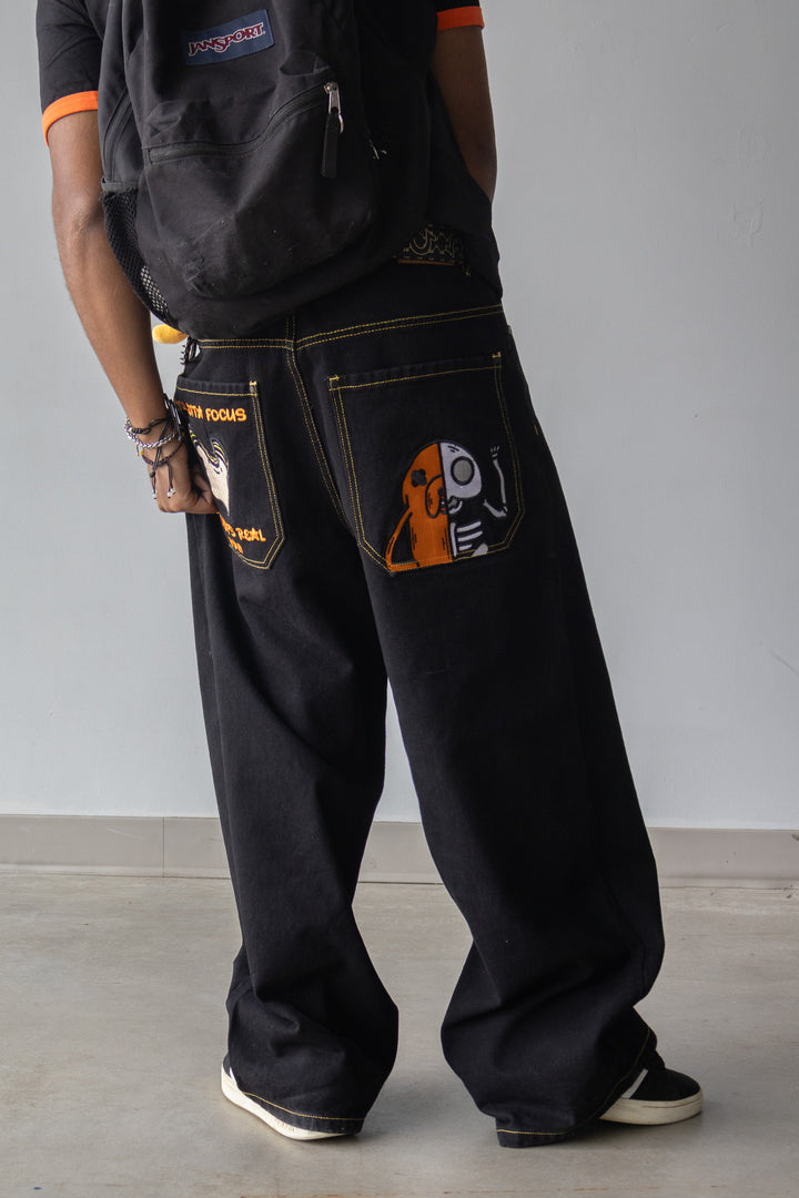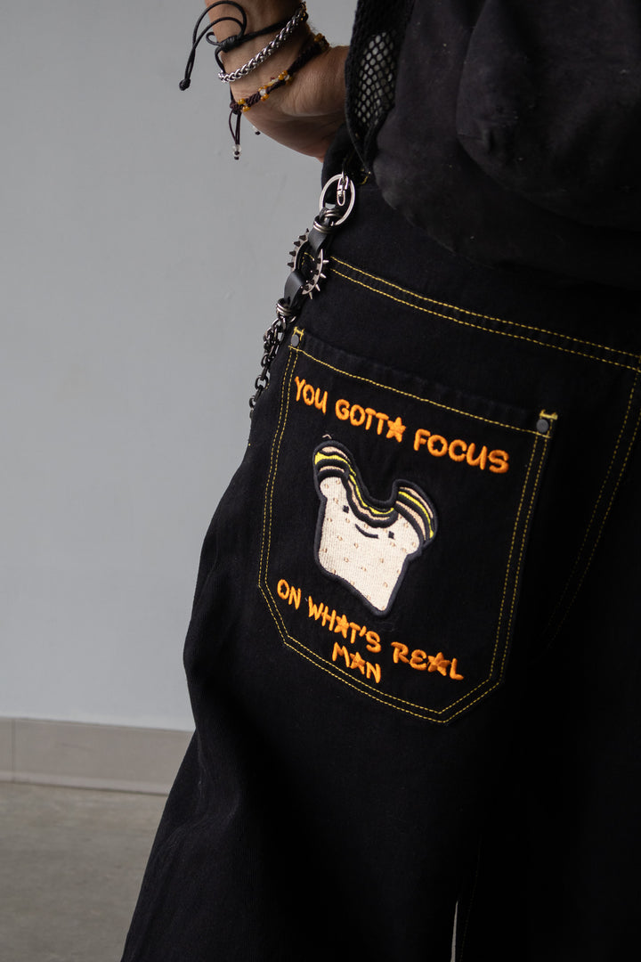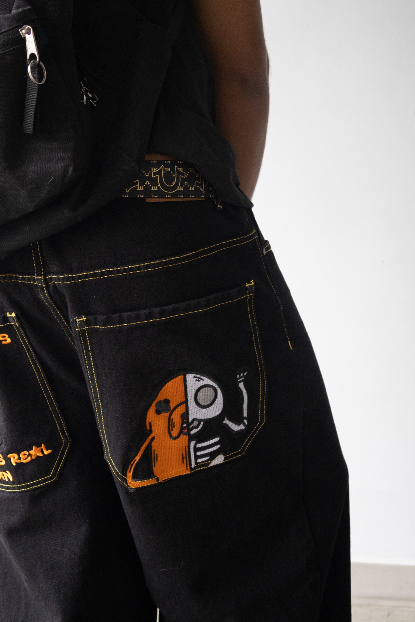 Color: Black Denim Material: Premium 100% Cotton 14 oz denim Details: Custom Orange stitching, large back pockets Print: Half-skeleton Jake embroidery on right back pocket. Sandwich graphic with quote: "You gotta focus on what’s real, man."