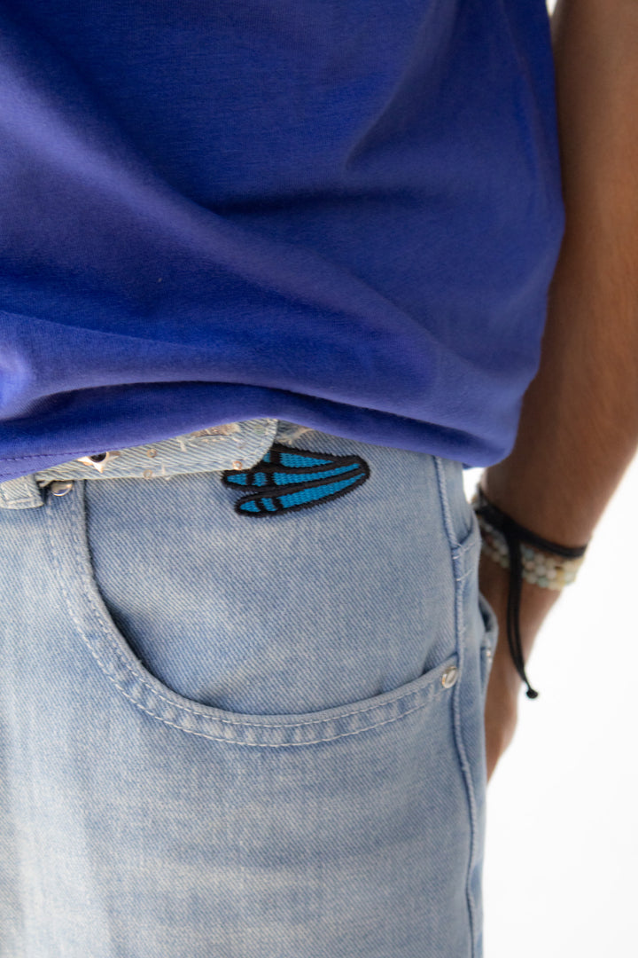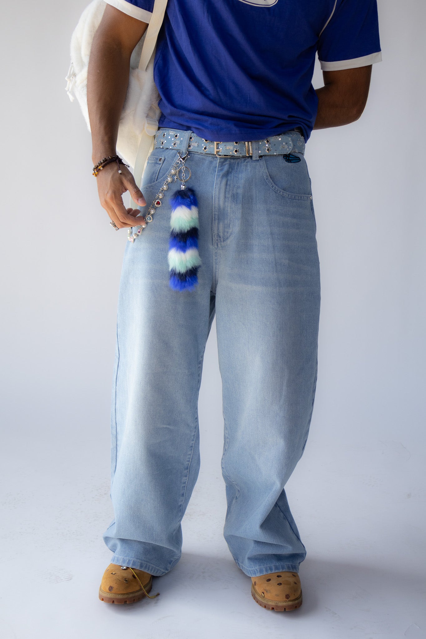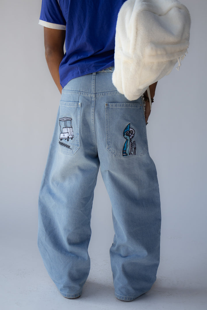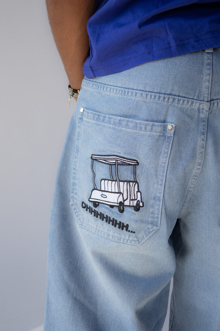 Color: LightBlue Denim With wash effect Material: Premium 100% Cotton 14 oz denim Details: Custom white stitching, large back pockets Print: Modercai on back right pocket. Golf Cart with "OHHHHHHH" on the left pocket. Modercai Tail on front pocket